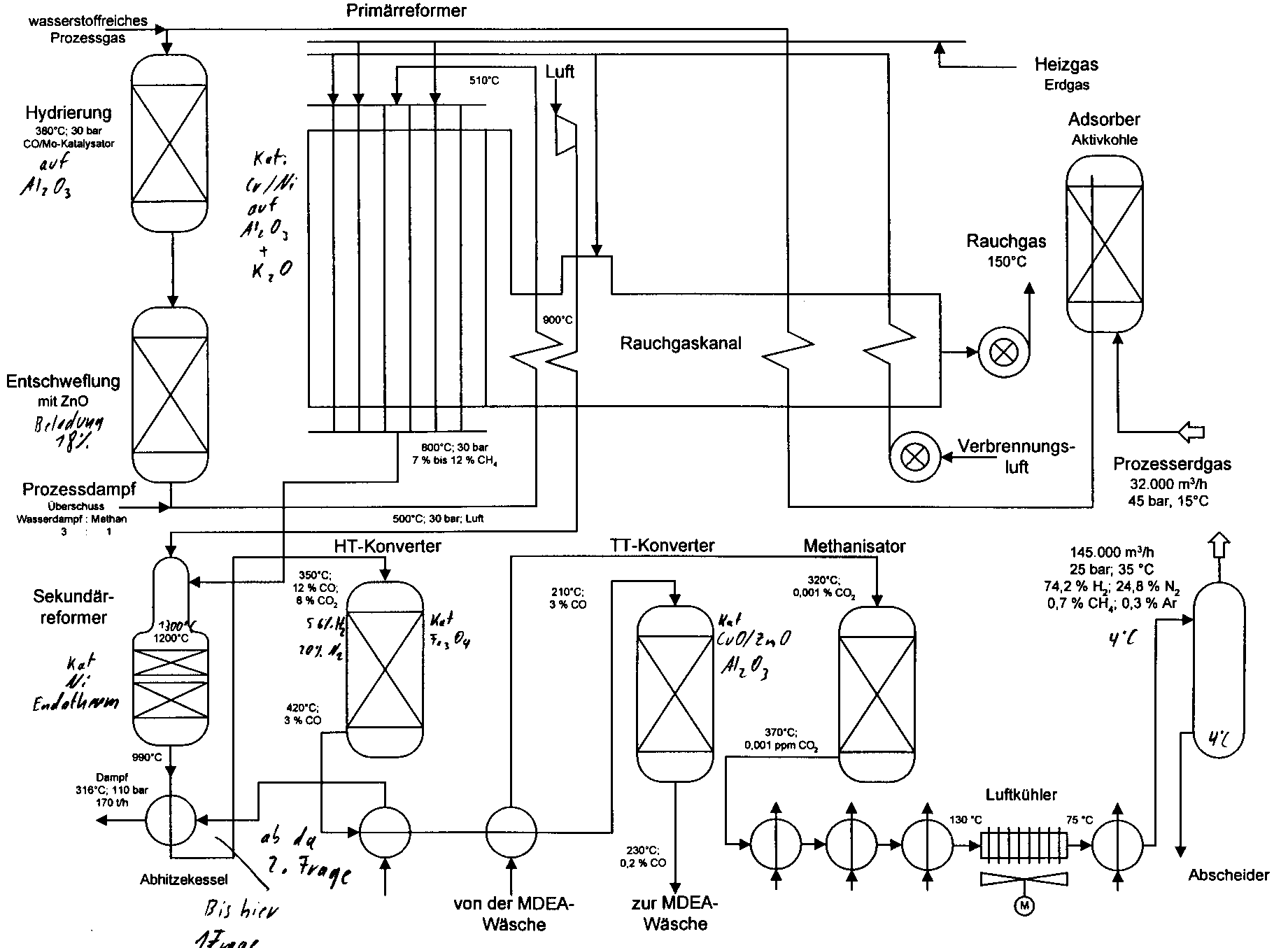 Primärreforming Katgifte sind S <0,5ppm, H2S, As, Pb Dem Gas (Methan – Butan) wird Wasserdampf im Verhältnis 3Dampf : 1Methan beigemischt. Als Reaktionspartner und um Kohlenstoffablagerungen zu verhindern. Anschliesend wird das Gas im Rauchgaskanal auf 510°C erhitzt und von oben in die Senkrechten mit Gas oder Öl beheizten, aus Chrom/Nickel Stahl gefertigten Röhren gefahren. Der Kat. in denRöhren ist Nickel auf Al2O3 als Trägersubstanz und K2O als Aktivator. Reaktionsbed. : 30bar, max. Spalttemp. 820°C, Reaktion = Allotherm. Das Methan wird mit Wasserdampf teilweise über CO zu CO2 + H2 umgesetzt. Restgehalt CH4 = 7% - 12% CH4 + H2O <----> CO + 3 H2 CO + H2O <----> CO2 + H2